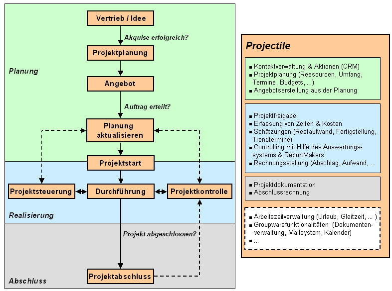 Die Abbildung 1 veranschaulicht die unterstützen Prozesse innerhalb der Projektabwicklung mit Projectile: