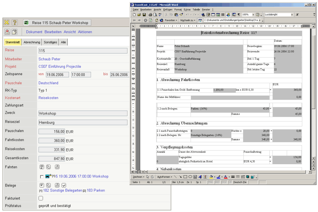 In den Masken Reisekosten und Fahrtkosten werden komplette Reisen (einschließlich der zugehörigen Fahrten und Spesen) und alle Dienstfahrten erfasst und den entsprechenden Projekten zugewiesen. Das System berechnet automatisch Tagegelder und erzeugt Auswertungen über Reise- und Fahrtkosten.