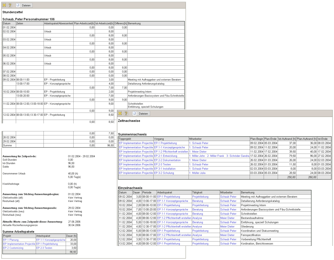 - Mitarbeiterzuordnung und Tätigkeitsnachweise für Projekte und Kunden,