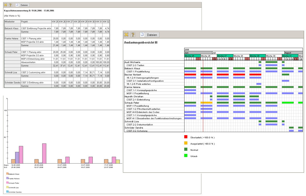 Die Kapazitätsauswertungen zeigen die konkreten Über- und Unterlastungen der Mitarbeiter über frei definierbare Zeiträume, bezogen auf variable Perioden, an. Dabei werden Feiertage und die Abwesenheiten der Mitarbeiter berücksichtigt.