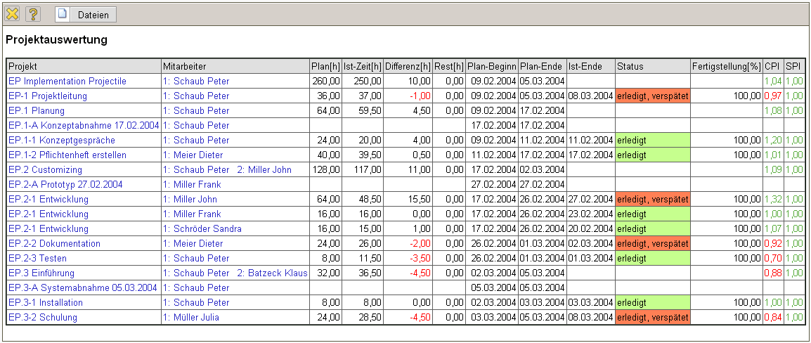 Die Projektauswertung ermöglicht vielfältige Auswertungen bezüglich des Verlaufs einzelner Projekte und Arbeitspakete: Soll/Ist-Vergleiche, Projektstrukturpläne, Meilenstein-Trend-Analysen, etc.