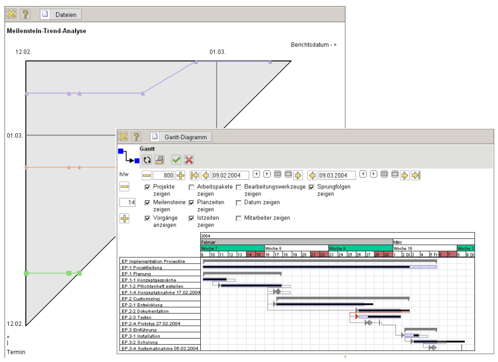 Abbildung 21: Terminauswertungen (Gantt-Diagramm, Meilenstein-Trend-Analyse)