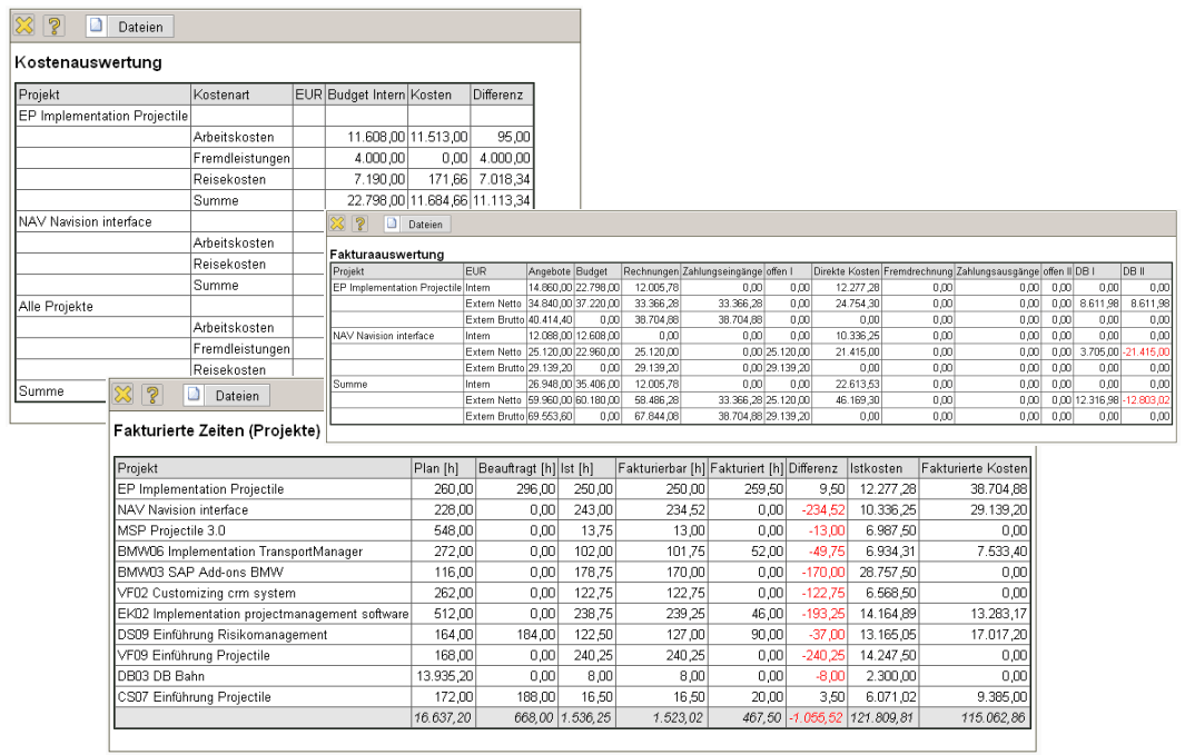 - Darstellung der gesamten Ertrags- und Kostenkette vom Angebot über Budgets und den tatsächlichen Kosten bis hin zu den fakturierbaren Leistungen, gestellten Rechnungen und (noch offenen) Zahlungsströmen.