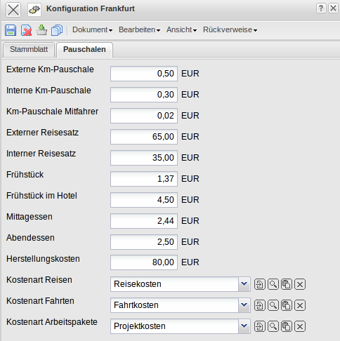 • Kostenarten (Reisen, Fahrten, Arbeitspakete): Diese Felder werden zur Vorbelegung bei Reisen und Fahrten, sowie bei der Übernahme von Arbeitspaketen in Angeboten, Auftragsbestätigungen und Rechnungen verwendet.