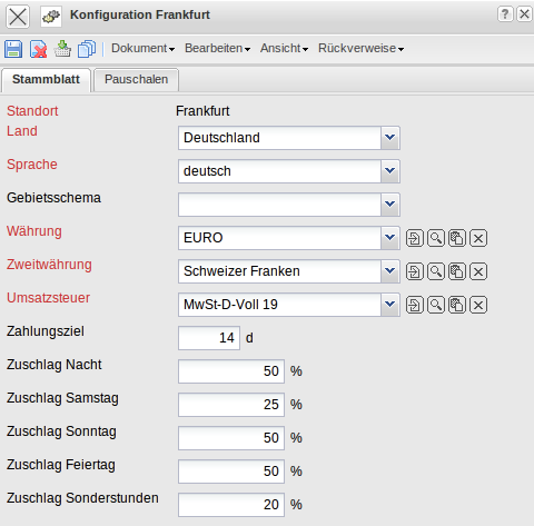 Die Maske Konfiguration verwaltet die Parameter für das gesamte System. Dazu gehören die firmenspezifischen Parameter Standort, Land, Sprache und die Währungen, die als Voreinstellungen für die Stammdaten herangezogen werden. Außerdem werden hier die Km-Pauschalen und Reisestundensätze für die Kostenrechnung hinterlegt und der Parameter für das Zahlungsziel definiert. Darüber hinaus können hier auch Mahlzeitenstellung und Zuschläge firmenweit definiert werden.