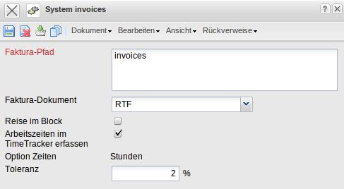 Die Maske System verwaltet die Systemparameter in Projectile. Dazu gehört der Pfad für die Fakturadokumente und weitere Systemeigenschaften.