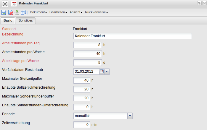 Die Maske Kalender verwaltet Betriebskalender der Standorte für das System. Hier ist es möglich für jeden Standort der Firma, die Tages- und Wochenarbeitszeiten, sowie die Anzahl der Arbeitstage pro Woche zu definieren. Diese Daten werden für die Übersichten und die Ressourcenplanung (speziell für die Bestimmung der Soll-Arbeitszeiten) benötigt. Darüber hinaus können hier die Eckwerte für die Arbeitszeitverwaltung verwaltet werden.