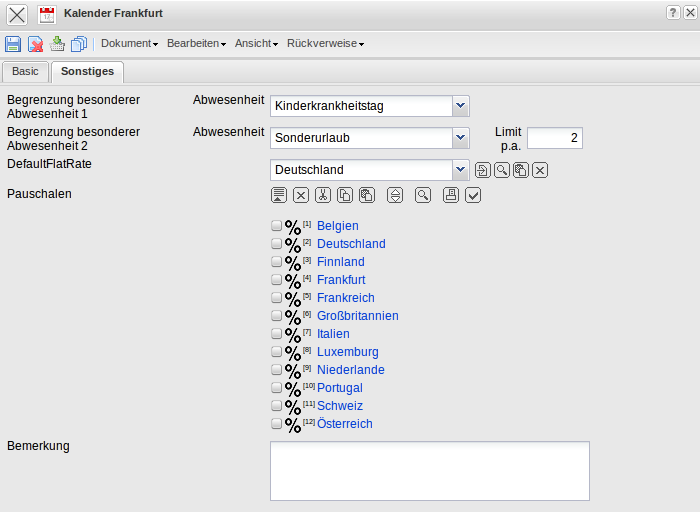 - Begrenzung besonderer Abwesenheiten1 und Abwesenheiten2: In diesen Feldern kann man den Grund der Abwesenheit auswählen (Kinderkrankheitstag, Sonderurlaub)
