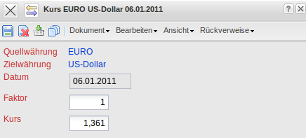 Der Dokumenttyp Kurs verwaltet die Währungskurse für die Umrechnung zwischen zwei Währungen. Dafür wird zwischen der Quellwährung und der Zielwährung ein Faktor mit entsprechendem Kurs definiert. Die Umrechnungskurse werden für die Konvertierung der Währungsfelder benötigt.