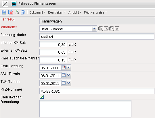Die Maske Fahrzeug verwaltet die Fahrzeuge im System. Den Fahrzeugen wird ein Halter und Termine für Untersuchungen zugewiesen. Die Fahrzeuge werden für die Fahrtkostenabrechnung benötigt.