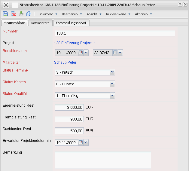 - Projekt: In diesem Feld wird das Projekt, das am Anfang des angelegten Statusberichts ausgewählt wurde, angezeigt.