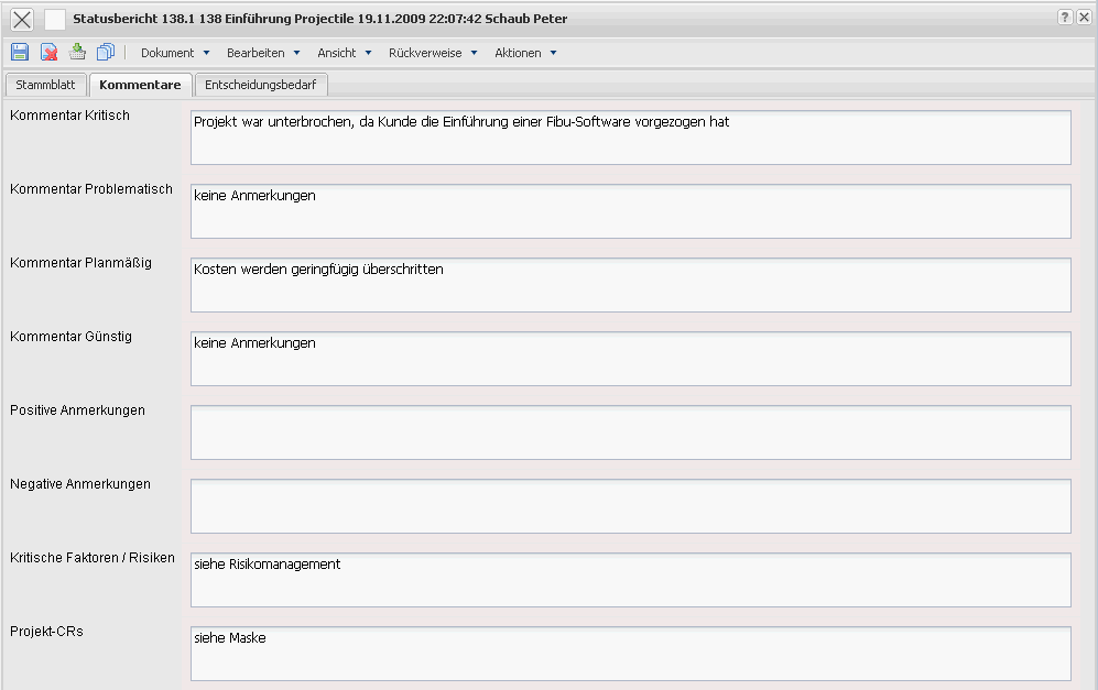- Kommentare: In diesen Feldern können Kommentare zu den folgend aufgelisteten Punkten notiert werden, (Kritisch, Problematisch, Planmäßig, Günstig).