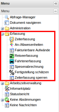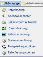 Projectile beinhaltet verschiedene Schnellerfassungen, wie beispielsweise die Abwesenheitserfassung (siehe auch Abschnitt 5.08.2 Abwesenheitserfassung), die Funktionalität “Fakturierbare Zeit” und die Erfassung “Fertigstellung schätzen”.