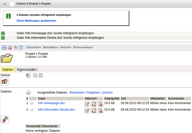 Projectile beinhaltet im optionalen Groupware-Modul eine integriert Dokumentenverwaltung. Mit Hilfe der Dokumentenverwaltung können auf dem Webserver Verzeichnisstrukturen erstellt sowie Dateien abgelegt und verwaltet werden. Die Dokumentenverwaltung beinhaltet persönliche Ordner und Projektordner. Diese Ordnerstrukturen unterliegen komplett dem Berechtigungssystem.