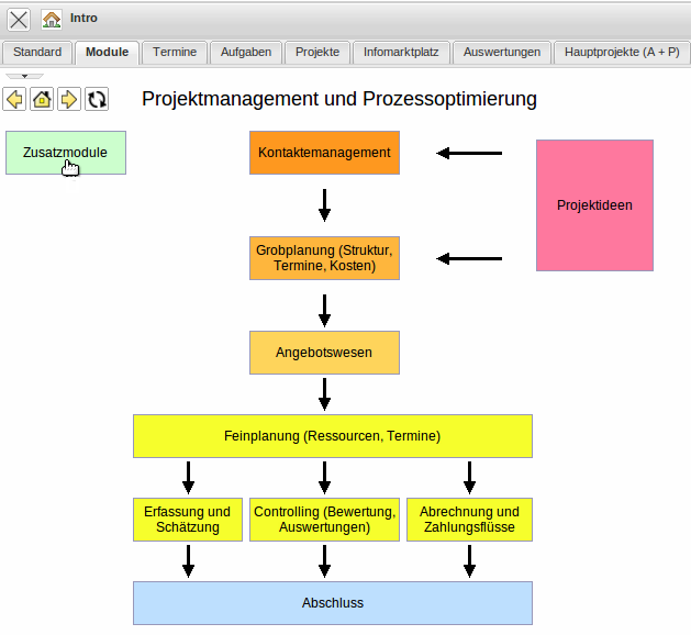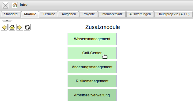 Im Eingangsbildschirm “Modulansicht” können die Funktionalitäten …