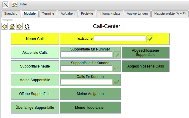 Im Modul Call-Center können ein- und ausgehende Calls, die daraus entstehenden Supportfälle und die zugeordneten Nachrichten verwaltet werden.