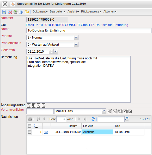 • Supportfälle: Jeder Call kann aus beliebig vielen Supportfällen bestehen. Diese Supportfälle sind auf den Call bezogene Aufgaben mit Priorität, Status, Zieltermin und Zuständigkeiten.