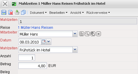- Reise: Dieses Feld kennzeichnet eine Reise der eine Mahlzeit zugeordnet werden kann. Die Definition einer Reise erfolgt in der Maske Reise.