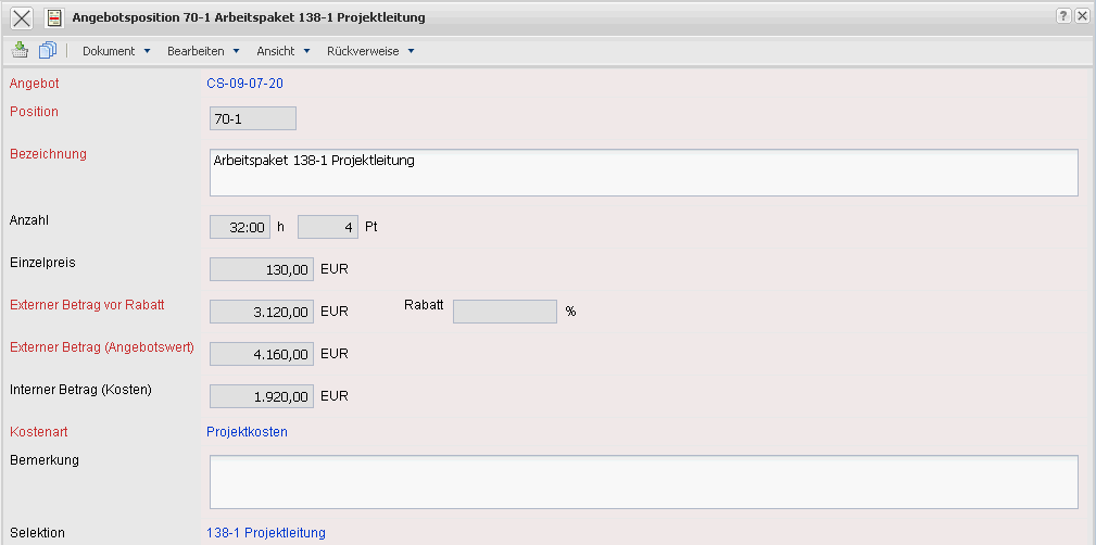 Die Maske Angebotsposition beinhaltet den Verweis auf das Angebot sowie Informationen über die Position, Bezeichnung, Anzahl der Stunden oder Einheiten, den externen und internen Betrag der Angebotsposition und die Kostenart. Der Angebotswert bestimmt sich aus den Beträgen der einzelnen Angebotspositionen.