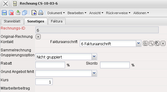 • Sammelrechnung: Dieses Feld enthält bei Sammelrechnungen einen entsprechenden Verweis auf die Sammelrechnung (nicht in der Standardversion enthalten).