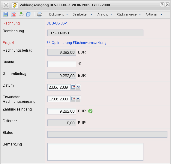 • Differenz: Dieses Feld weist die Differenz zwischen dem Rechnungsbetrag und dem Zahlungseingang aus.