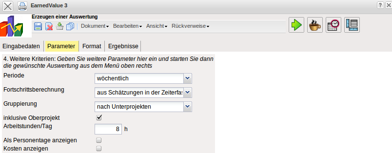 Die Auswertung Earned-Value-Analyse listet für ein Projekt über beliebige Perioden die Plan- und Istaufwände (in Stunden oder Personentagen) sowie den Fertigstellungsgrad (Fortschritt zur Vorperiode) ab. Aus diesen Daten wird der sogenannte Earned Value und weitere Kennzahlen (BCWS, ACWP und BCWP) bestimmt. Das besondere an der Earned Value Analyse ist, dass neben den Plan und den Ist-Werten als dritte Größe der gleichen Einheit der BCWP zur Projektbeurteilung herangezogen wird.