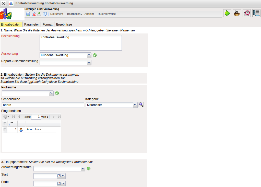 Die Kontaktauswertung generiert Kontakt- und Aktionslisten basierend auf den Daten des Kontaktsystems. Hier können beispielsweise alle Aktionen eines Mitarbeiters, für einen Kunden oder alle offenen Aktionen aufgelistet werden.
