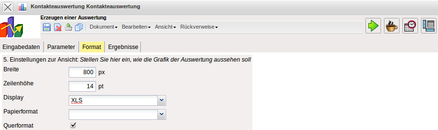 • Display: Mit Hilfe dieser Auswahl kann die erzeugte Auswertung in verschiedenen Formaten erzeugt werden. Unterstützt werden HTML (Standardeinstellung), CSV, XLS, RTF und PDF.