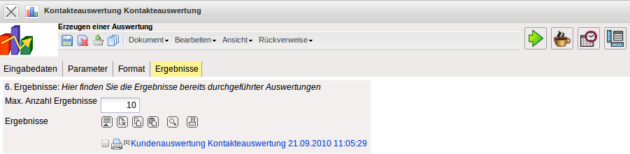In diesem Reiter befinden sich die maximale Anzahl der Ergebnisse und die Ergebnisse der bereits durchgeführten Auswertungen.