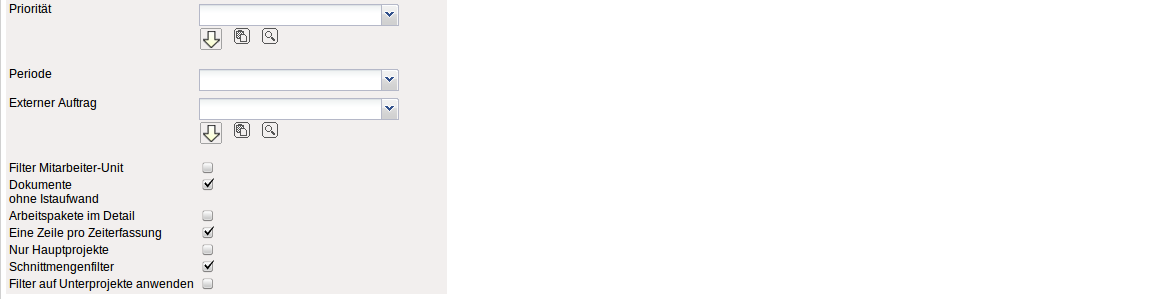 - Externer Auftrag: Diese Auswahl bezieht sich auf das Extern-Kennzeichen des Projektes und schränkt entsprechend die Auswahl des Projektes ein (es werden nur externe Projekte angezeigt).