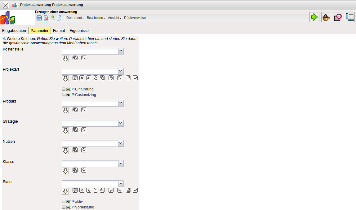 - Produkt, Strategie, Nutzen, Klasse: In diesen Auswahlboxen können als Selektionskritierium Produkt, Strategie, Nutzen und Klasse gewählt werden. Diese Selektionen beziehen sich jeweils auf die gleichnamigen Felder im Projekt.