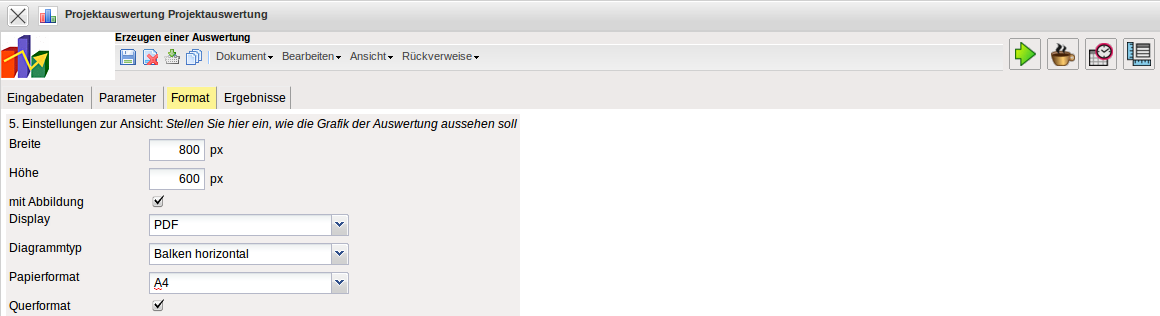 - Auswertung: Die Projektauswertung beinhaltet folgende Auswertungen:
