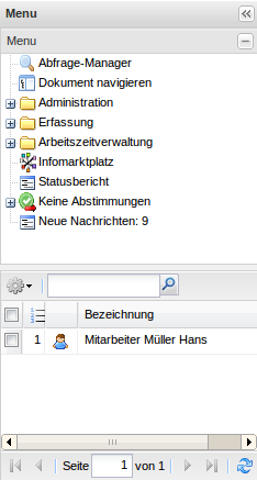 Das linke Navigationsmenü besteht aus den Funktionalitäten Abfrage-Manager, Navigation und Funktionen für die Administration, der Erfassungskomponente, verschiedene Module der Enterprise Version von Projectile, die Menüpunkte für die Abstimmungen und die internen Benachrichtigungen. Darüber hinaus beinhaltet das linke Navigationsmenü die persönliche Ablage und den Fenstermanager.