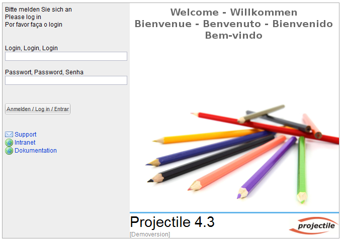 Damit sich ein Benutzer im System anmelden kann, ist es notwendig, diesen Benutzer als Mitarbeiter zu definieren. Nach dem Start der Anwendung (Bookmark im Browser oder Eingabe der URL) erscheint zunächst der Login-Bildschirm. Die Startadresse hat in der Regel folgenden Aufbau: http://projectile-server/projectile/start.