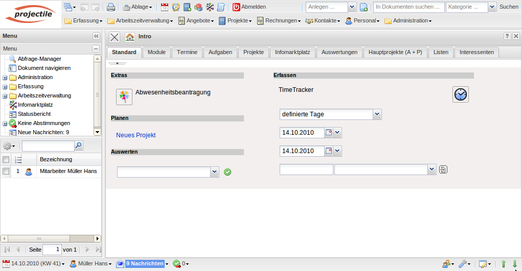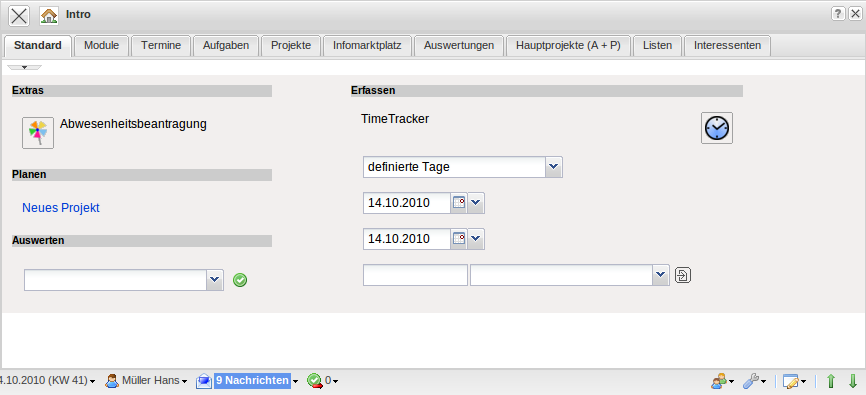 Im zentralen Bereich befindet sich das Intro mit frei definierbaren Eingangsbildschirmen. Das Beispiel zeigt den Standard-Bildschirm mit Funktionalitäten zum Anlegen neuer Daten, der Projektplanung, dem Auswertungssystem und der Leistungserfassung TimeTracker.
