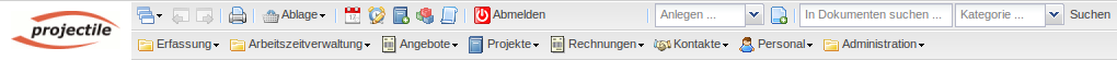 Die obere Navigationsleiste besteht aus einer oberen Menüleiste, der „Blättern“-Funktionalität, einer Toolbar, einer Suchmaschine und der “Home-Funktionalität” (Projectile-Logo).