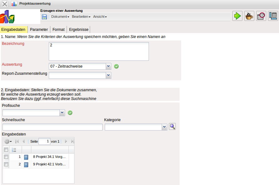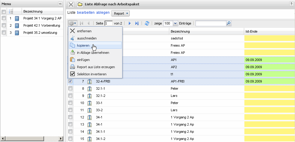Im Beispiel sind zwei Projekte aus der persönlichen Ablage in die Projektauswertungen übertragen worden.