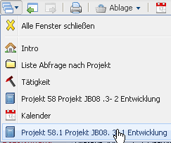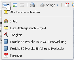 Im oberen Teil des Arbeitsbereiches befindet sich eine Auflistung der bereits geöffneten Masken - der Fenstermanager. Die aufgelisteten Masken können direkt über diese Liste geöffnet werden. Im Beispiel befinden sich der Arbeitsbereich (Intro) und die Datensätze für die Projektsuche, Tätigkeit, das Projekt 58 Projekt JB08 .3- 2 Entwicklung, das Projekt 59 Projekt Einführung Projectile und der Kalender.