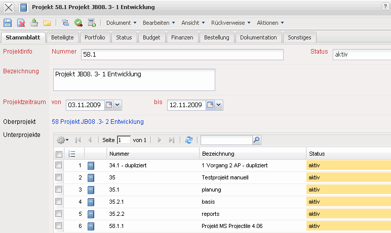 … wird die Verlinkung des Eintrages genutzt und das entsprechende Dokument (hier das Projekt 58.1 Projekt JB08. 3- 1 Entwicklung) wird geöffnet.