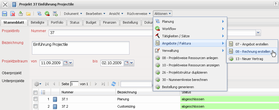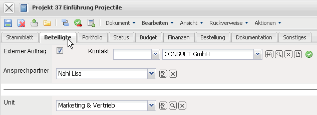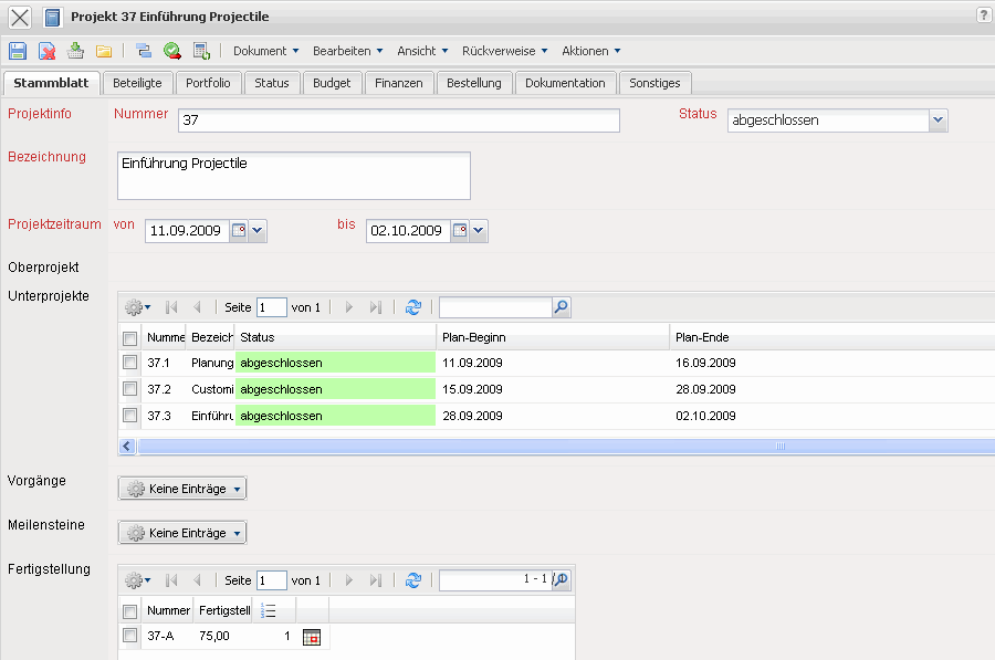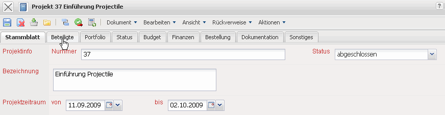 Projectile besteht größtenteils aus Masken. Alle Masken im System, mit Ausnahme der Auswertungen und des TimeTrackers, haben den selben Aufbau. Dieses Beispiel zeigt eine Projektmaske.