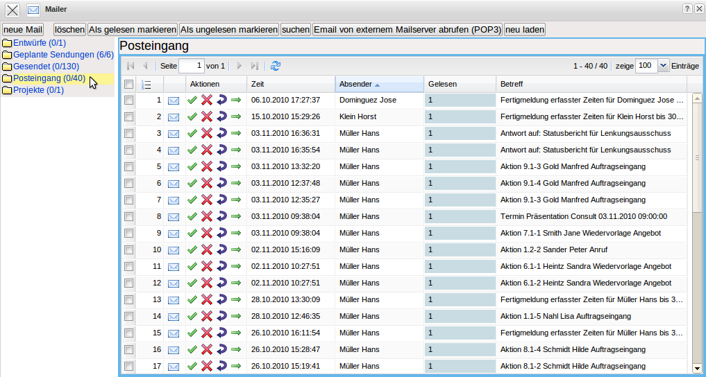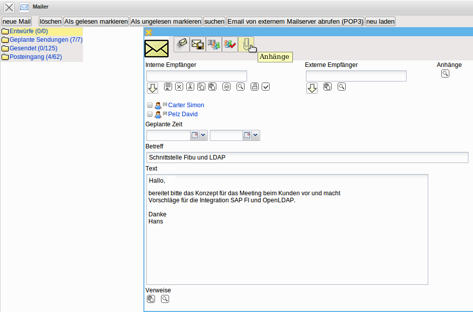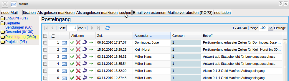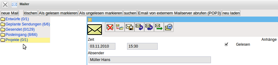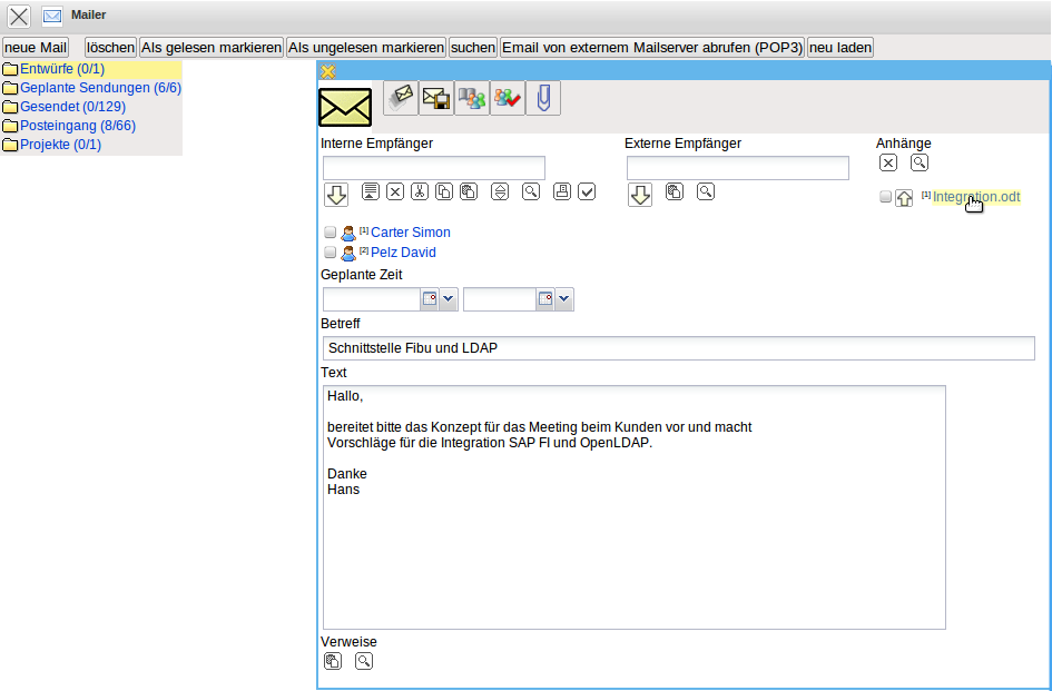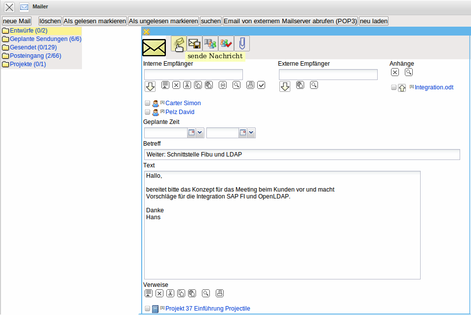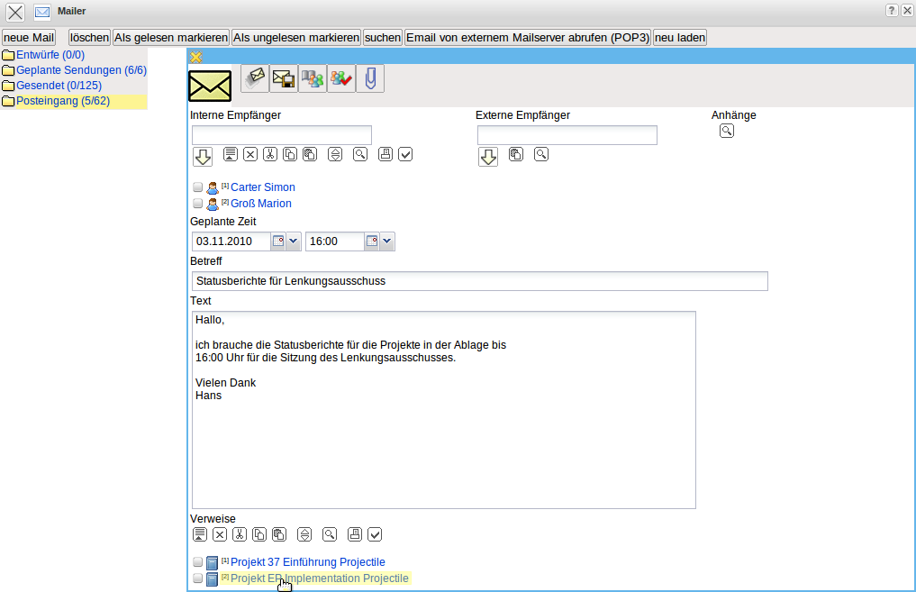 Interne Mails können, neben der eigentlichen Nachricht, auch beliebige und beliebig viele Projectile-Masken beinhalten. Diese Maske werden als Verweise in den Mails angelegt und können vom Empfänger der Nachricht (wenn eine entsprechende Berechtigung vorhanden ist) direkt geöffnet werden. Im Beispiel enthält die Nachricht zwei Verweise auf Projekte, die der Empfänger …