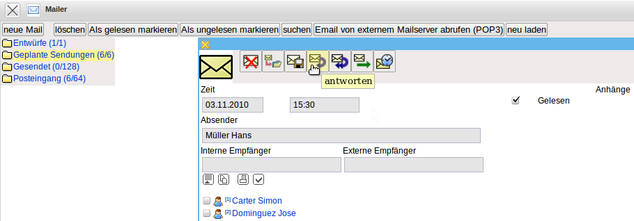 Diese Funktionalität erstellt die Antwort. Dabei wird als Absender der Empfänger der Antwort eingetragen und es werden die Betreffzeile und der Text der Nachricht geändert.
