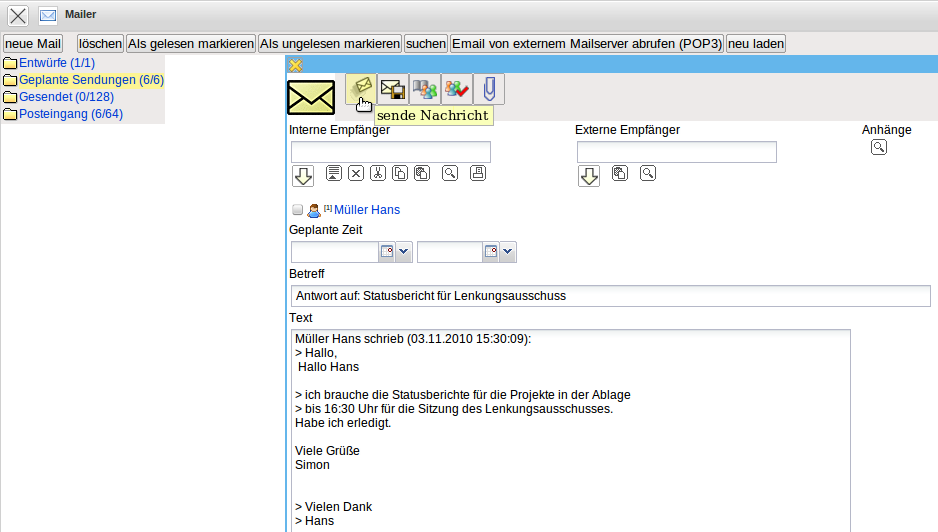 Mit Hilfe der Funktionalität “sende Nachricht” wird diese Nachricht an die Empfänger gesendet und …