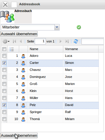 Nach Auswahl der Empfänger (hier aus der Gruppe der Mitarbeiter Simon Carter und David Pelz) und Bestätigung mit “Auswahl übernehmen” …