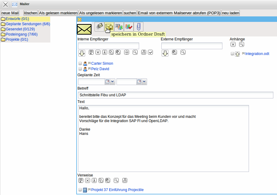 … Verweise eingefügt worden. Mit Hilfe des Button “speichern in Ordner Draft” wird die Mail abgespeichert.
