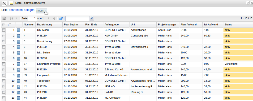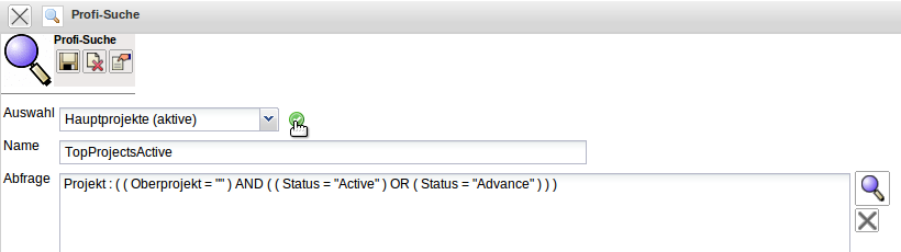 Im Beispiel wird eine Abfrage auf die Projekt-Stammdaten geladen, welche alle laufenden Haupt- oder Oberprojekte auflistet (nähere Informationen finden Sie im Kapitel 3.05 Profi-Suche).
