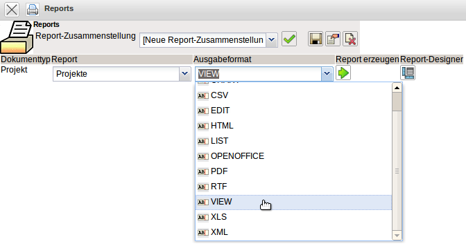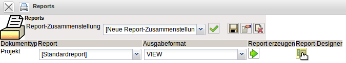 In der Auswahlbox Report kann entweder der Standardreport (eine Auflistung aller verfügbaren Elemente des Dokumentes) oder (wenn vorhanden) ein definierter Report ausgewählt werden. Als Ausgabeformat kann zwischen