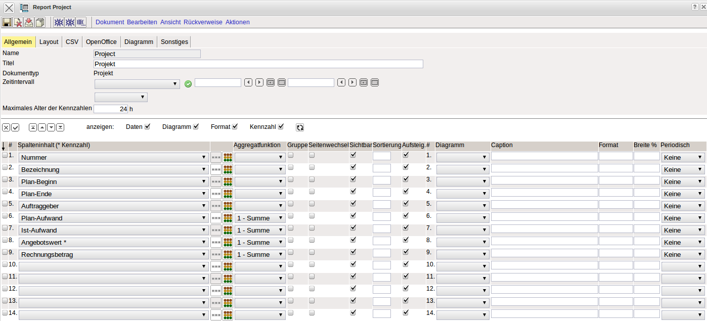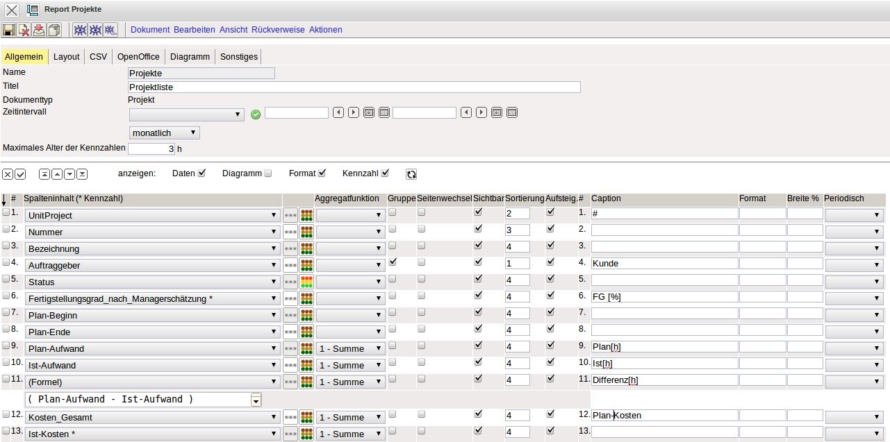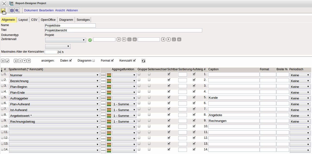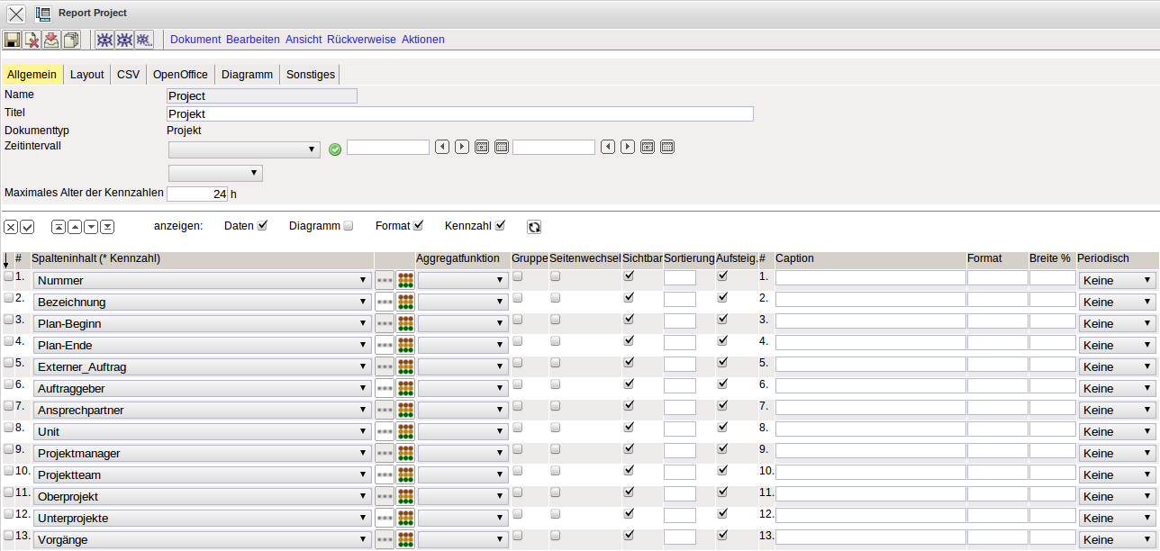 Im Standardreport werden alle Elemente, die sich im Dokument Projekt befinden, als Zeilen aufgeführt (beispielsweise Projekt, Auftraggeber, Ansprechpartner, Projektmanager, …).