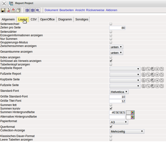 Im Reiter “Layout” können Einstellungen bezüglich des Reportlayouts definiert werden. Hier kann u.a. die Anzahl der Zeilen pro Seite, Seitennummerierung, Gruppierungsarten, Kopf- und Fußzeilenlayout sowie Seitenformate eingestellt werden.