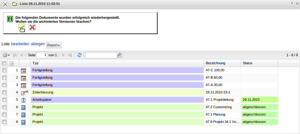 Das System zeigt nach der Wiederherstellung alle Dokumente an (hier 144 Dokumente mit Oberprojekt, Unterprojekten, Arbeitspakete, Zeiterfassungen, Angeboten, Rechnungen, …).